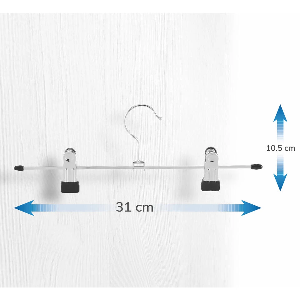 Hoge kwaliteit: Deze kledinghangers zijn gemaakt uit metaal en hebben een PVC laag aan de klem. Deze anti-slip PVC coating zorgt er voor dat je kledij mooi blijft hangen, zonder plooien of kreuken.