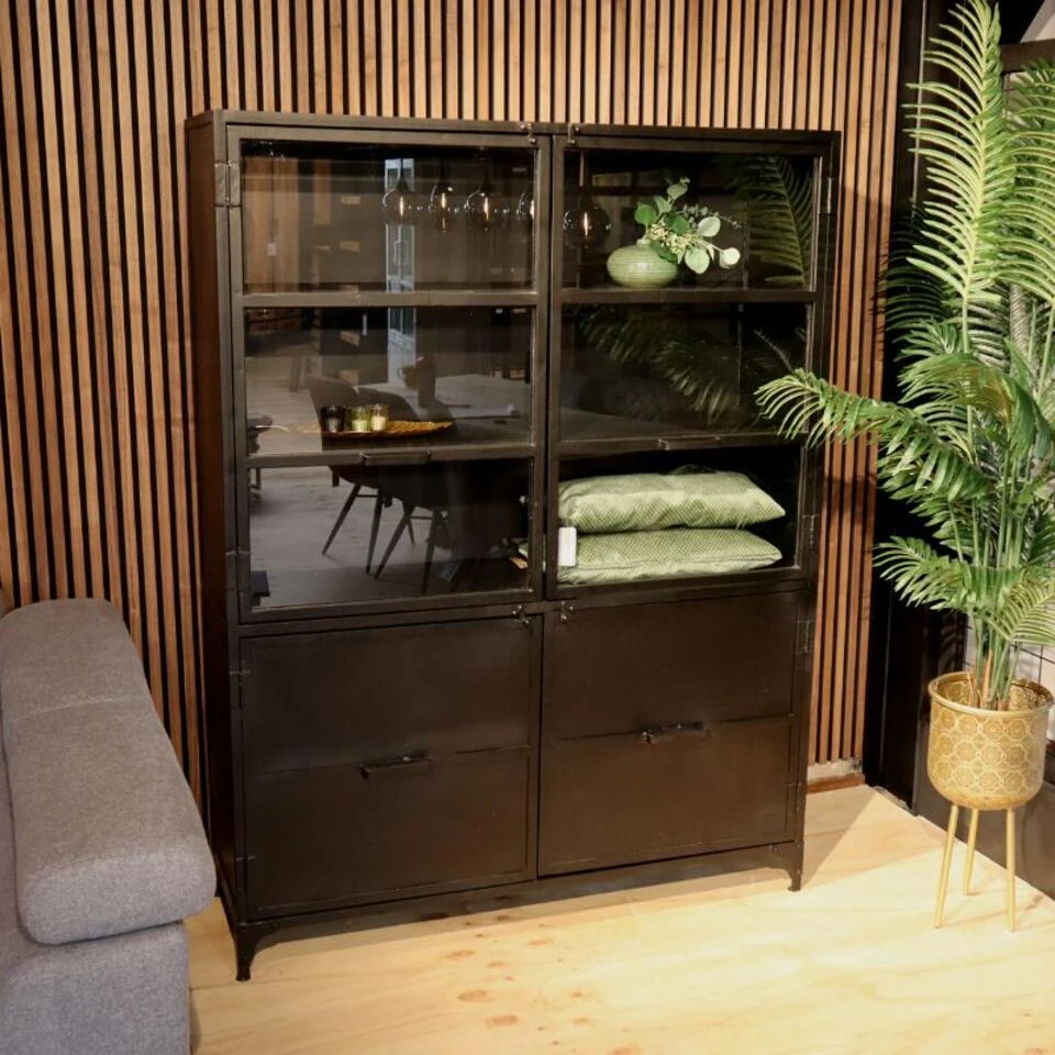 Bij deze Garcia vitrinekast gaat het om stoere en robuuste uitstraling. Dit komt duidelijk terug in de grove handvaten en de opgezette scharnieren. Het is een robuuste kast die zowel in je woonkamer als in je thuiskantoor of in de keuken kan geplaatst worden. Deze kast is volledig in zwart, maar er is ook een variant met naturel houten legplanken.