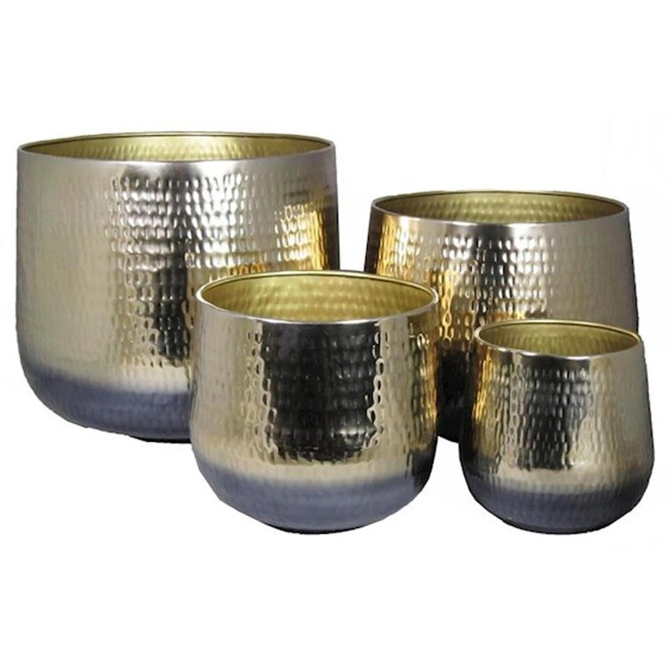 Bloempot/plantenpot Athene van metaal goud. Bloempotten met een mooie afwerking aan de buitenkant. Gewicht: 1.7 kilo. Metaal is onmisbaar in een groen en comfortabel interieur. Decoreer de pot met droogbloemen of een diep groene plant voor een luxueus jungle effect.